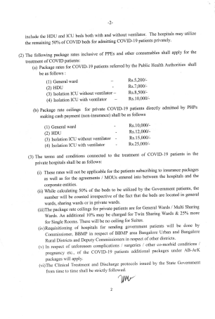 The Karnataka government has announced the following rates for treatment of Covid-19 patients referred by the authorities to private hospitals, as well as for Covid-19 patients directly admitted by private hospitals, as per an order issued on Tuesday by Chief Secretary Vijay Bhaskar.