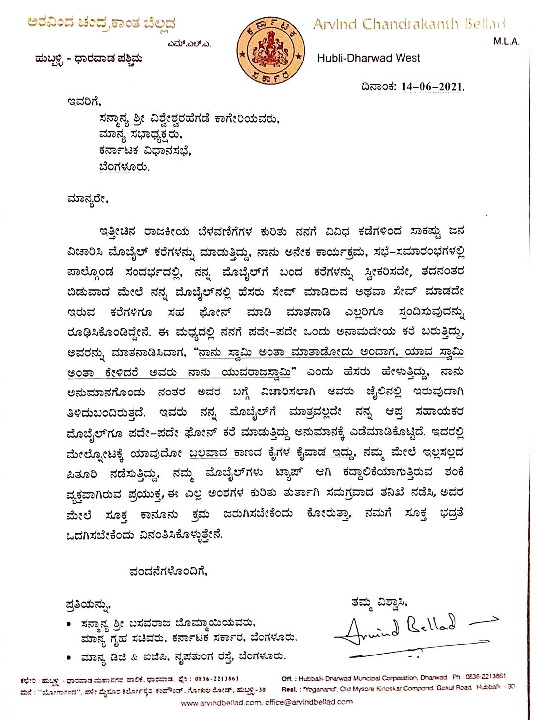 The MLA from Hubli-Dharwad West said he has petitioned Home Minister Basavaraj S Bommai and Assembly Speaker Vishweshwar Hegde Kageri in this regard for an inquiry and to get the matter investigated.