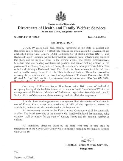 Karnataka Health and Family Welfare Department officials have happily obliged their political masters by incorporating the best equipment and facilities for Covid treatment in the guest house. The department announced through it’s official twitter account: “Kumar Krupa Guest House to be used as 100-bed Covid19 treatment centre for designated category of Covid19 positives.”