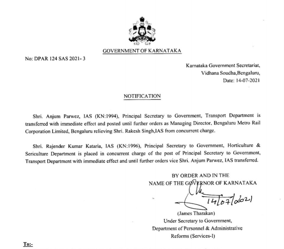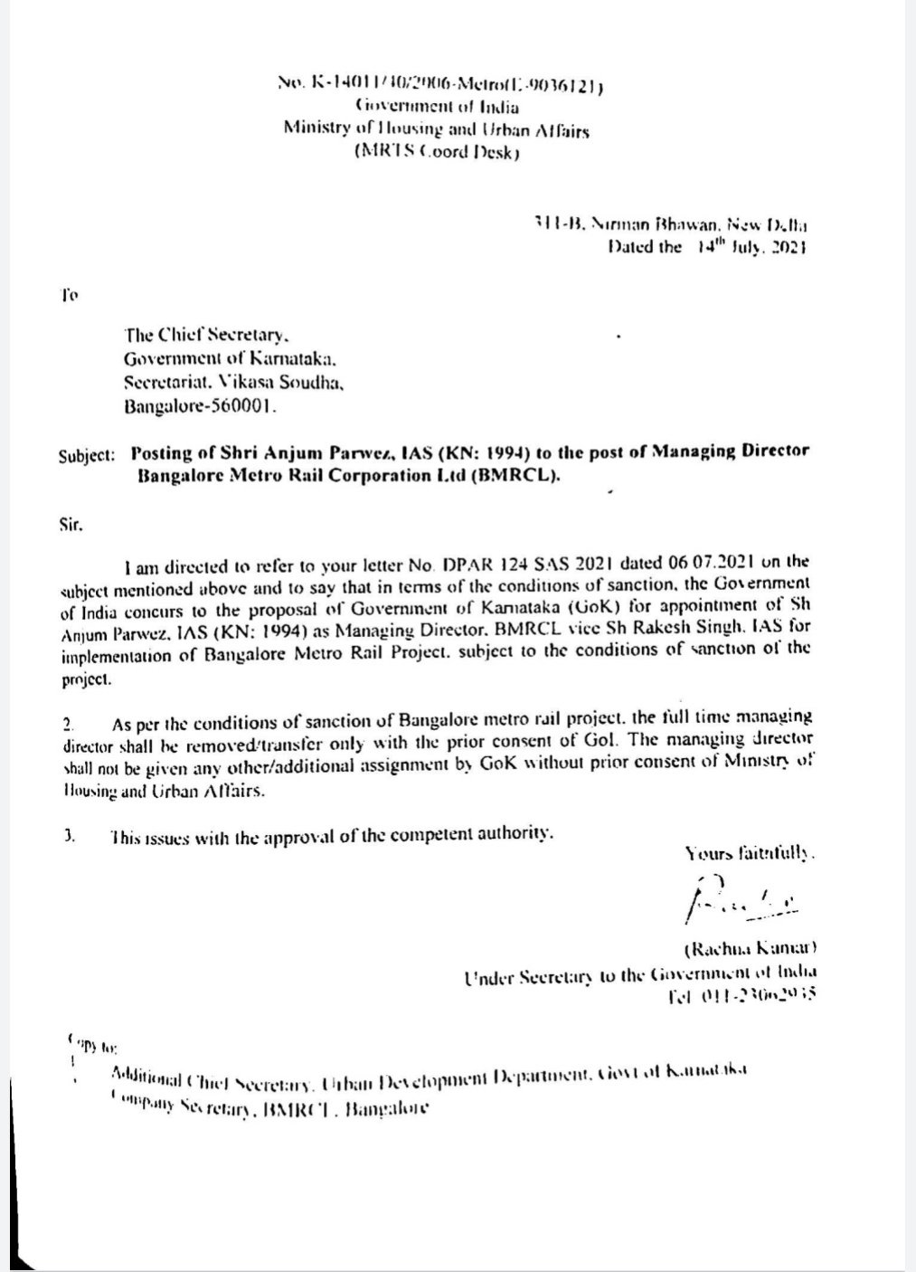 “The Government of India concurs to the proposal of Government of Karnataka (GoK) for appointment of Anjum Parwez, IAS (KN: 1994), as Managing Director, BMRCL,” the order reads.