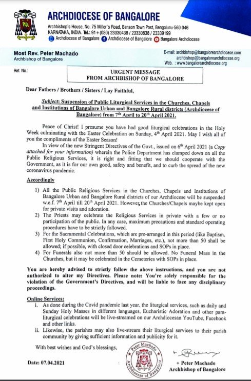 With rising coronavirus cases, the Archbishop of Bengaluru Rev Peter Machado ordered the suspension of public liturgical services in churches, chapels and institutions of Bengaluru urban and rural districts from April 7 to 20.