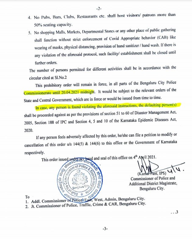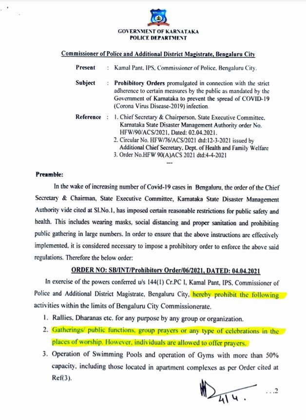 The directives came as the Bengaluru police Commissioner Kamal Pant in his prohibitory orders banned congregation of people at the religious places to prevent the spread of coronavirus. PTI