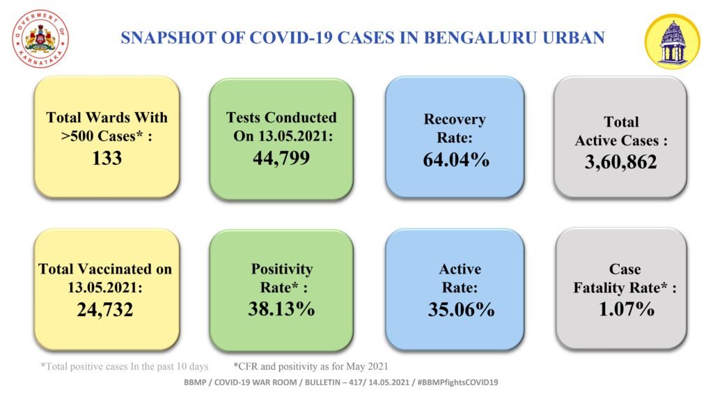 As per the Bruhat Bengaluru Mahanagara Palike (BBMP), on May 6, 23,706 fresh cases were reported, out of 60,944 cases samples that were tested – a positivity rate of about 39.69 per.