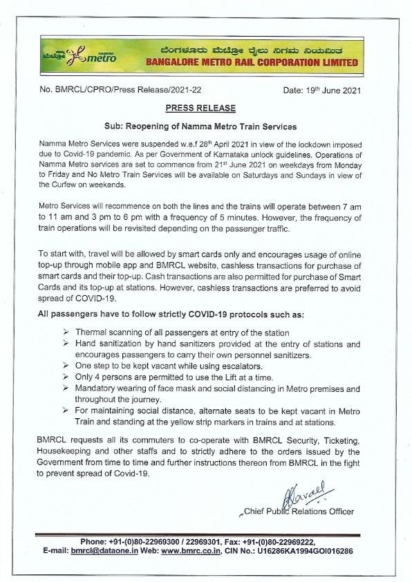 In a press release, BMRCL said Namma Metro services will resume on weekdays, though they will not be available on Saturdays and Sundays in view of the weekend curfew.