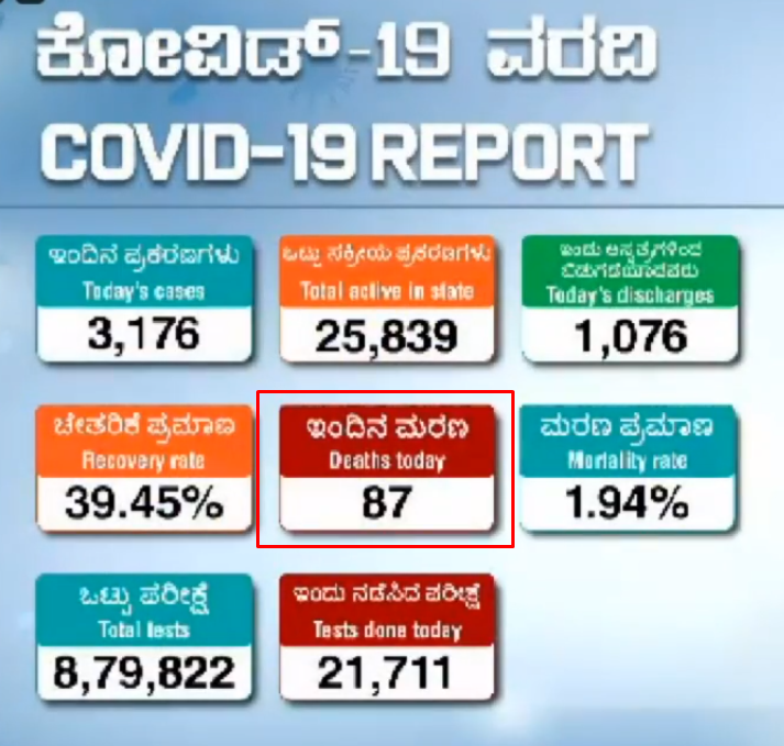 For the second straight day, Karnataka has recorded 87 deaths while the Covid- infected figures have reached another high in both the state and Bengaluru, with 3,176 and 1,975 fresh cases respectively.