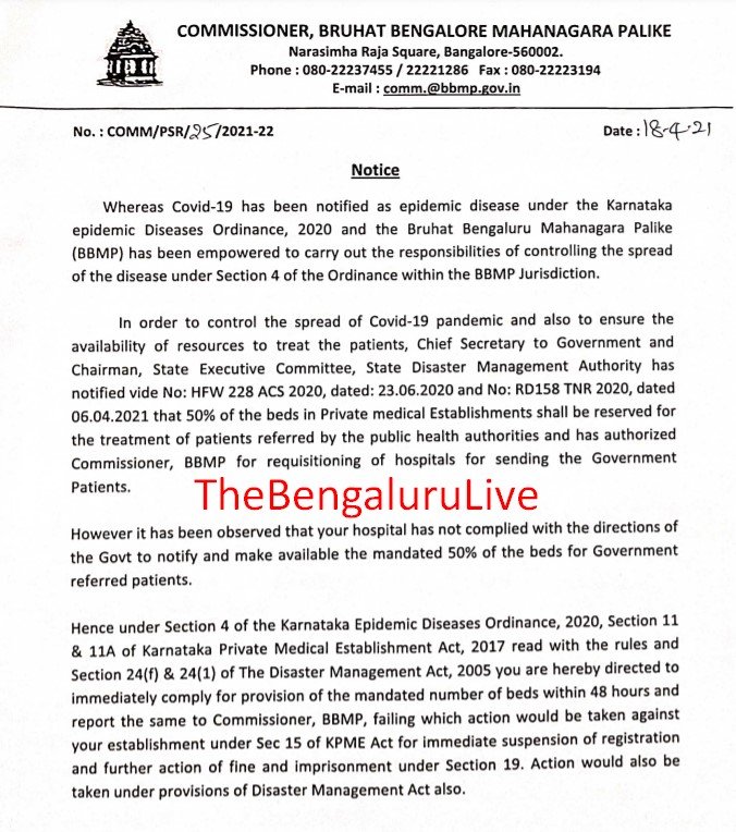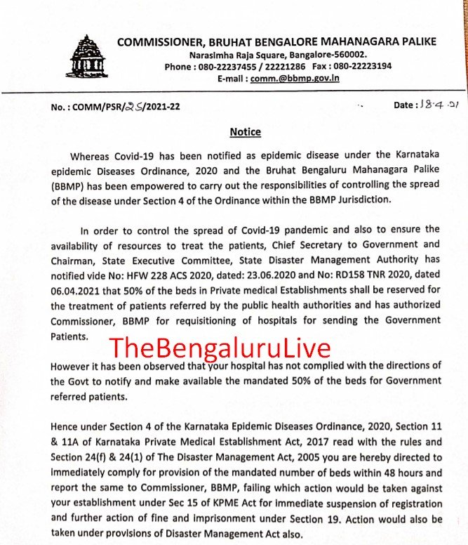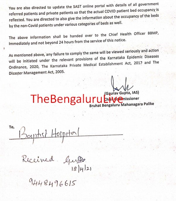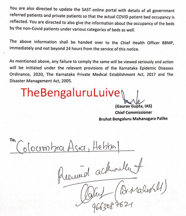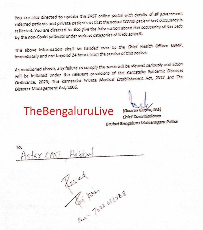 Gupta also inspected Aster CMI, Columbia Asia, Baptist hospitals and issued similar show cause notices to the hospital management for failing to comply with government orders.