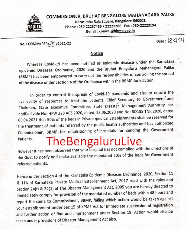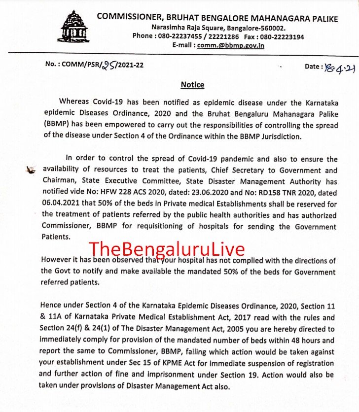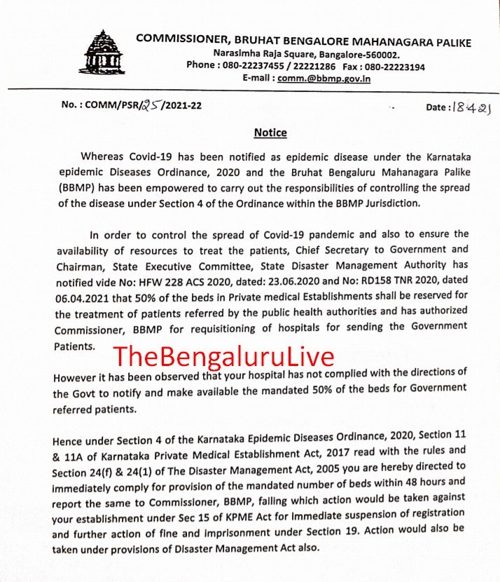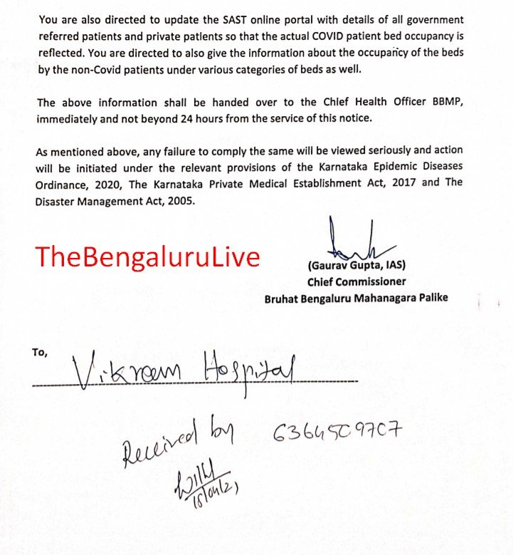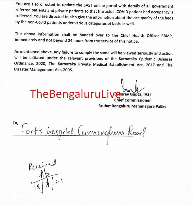 The Chief Commissioner has issued show-cause notices to two major hospitals — Fortis on Cunningham Road and Vikram Hospital — as both hospitals failed to provide the number of beds demanded by the civic agency for needy covid-19 patients.