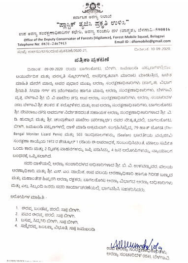 The raid was conducted by Belagavi forest staff, headed by DCF Manjunatha Gowda, with the assistance of Bagalkot forest staff. The team included forest officials Chandrasekhar Patil, Huddar, Suresh Nayak and Mahantesh, under the guidance of Seema Garg.