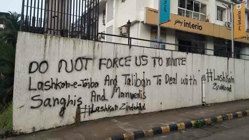 The graffiti reads: “Do not force us to unite…Lashkar-e-Toiba and Taliban…to deal with Sanghis and Manuvadis…#Lashkar Zindabad.”