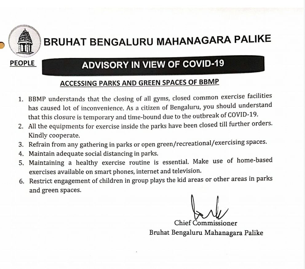 In a one-page advisory, BBMP Chief Commissioner Gaurav Gupta, expressing concern over public health, noted, “BBMP understands that the closing of gyms and common exercise facilities has caused a lot of inconvenience. As a citizen of Bengaluru, you should understand that this closure is temporary and time-bound due to the outbreak of Covid-19.”