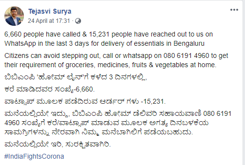 Bengaluru South MP Tejasvi Surya posted on this social media profile: “BBMP’s ‘Homeline’ in last 3 days — the number of callers is 6,660. Orders received through WhatsApp are 15,231. At home, receive the necessary supplies directly to your doorstep by calling / Whatsapp at BBMP Home Delivery Helpline 080 6191 4960.”