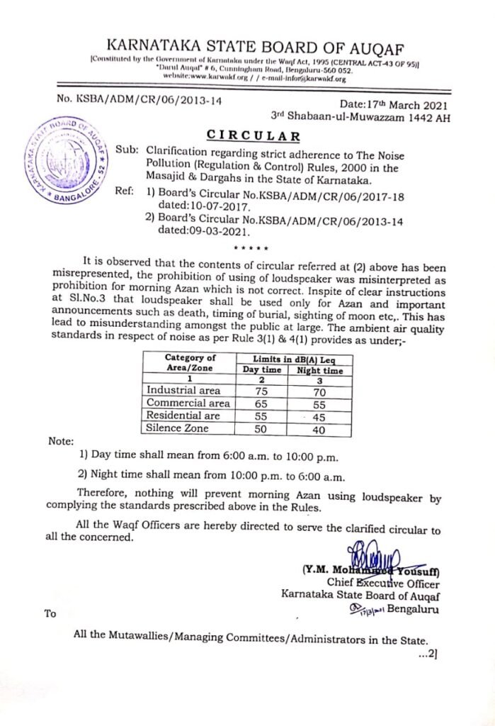 The Karnataka State Board of Auqaf clarified on Wednesday that its previous circular regarding ban on loudspeakers in mosques and mausoleums from 10 pm to 6 am was not about restricting the morning azan or call for prayer.