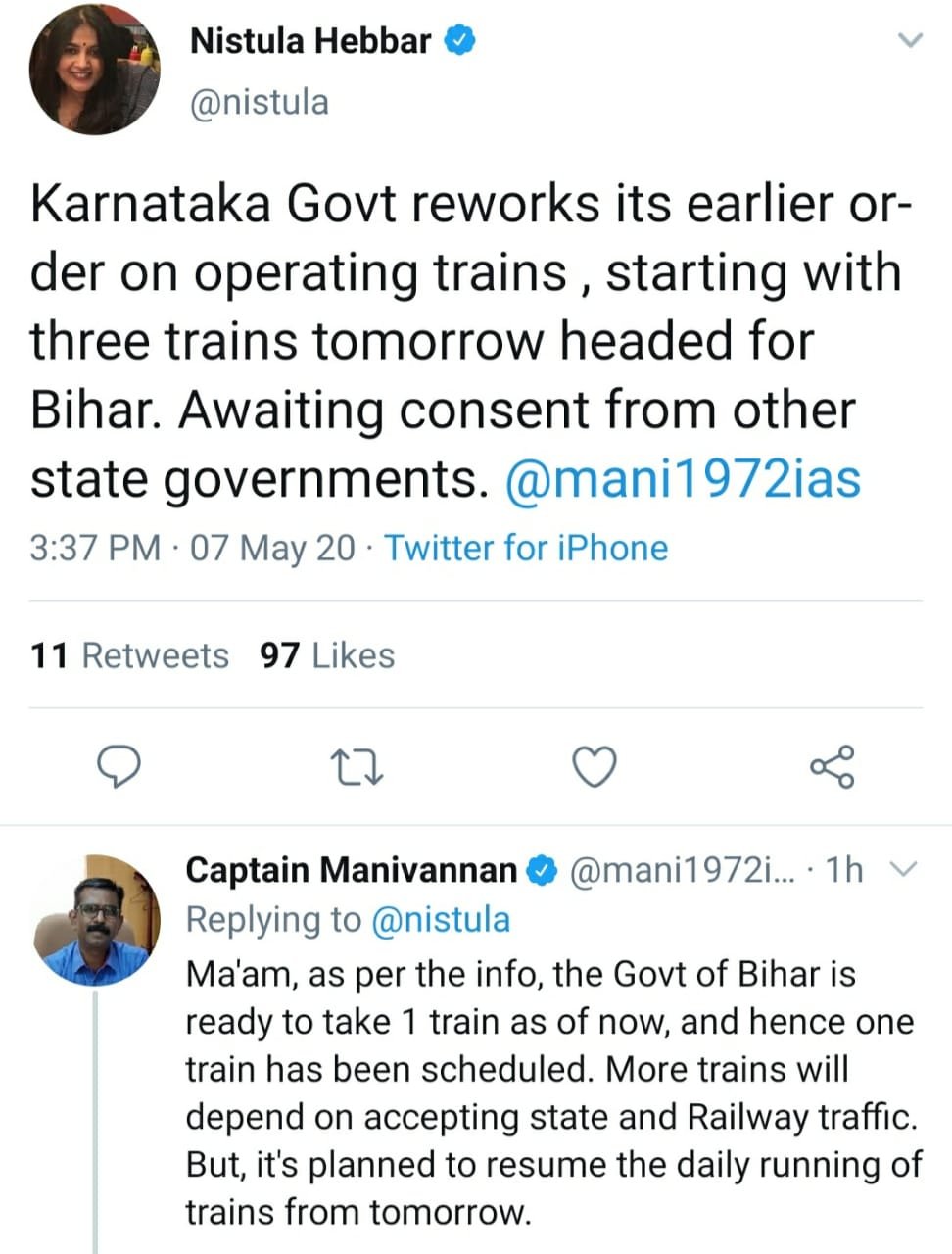 On Thursday, Labour Department prinicipal secretary Captian P Manivannan replied to a tweet thus: “Ma’am, as per the info, the Government of Bihar is ready to take 1 train as of now, and hence one train has been scheduled. More trains will depend on the accepting state and Railway traffic. But it’s planned to resume the daily running of trains from tomorrow.”
