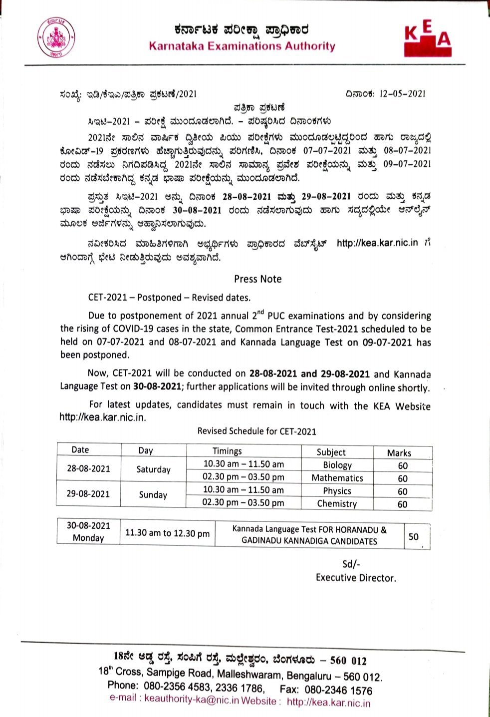 ರಾಜ್ಯದಲ್ಲಿ #COVID19 ಪ್ರಕರಣಗಳು ಹೆಚ್ಚಾಗುತ್ತಿರುವುದನ್ನು ಪರಿಗಣಿಸಿ, #CET2021 ಪರೀಕ್ಷೆಯನ್ನು ಮುಂದೂಡಲಾಗಿದೆ.