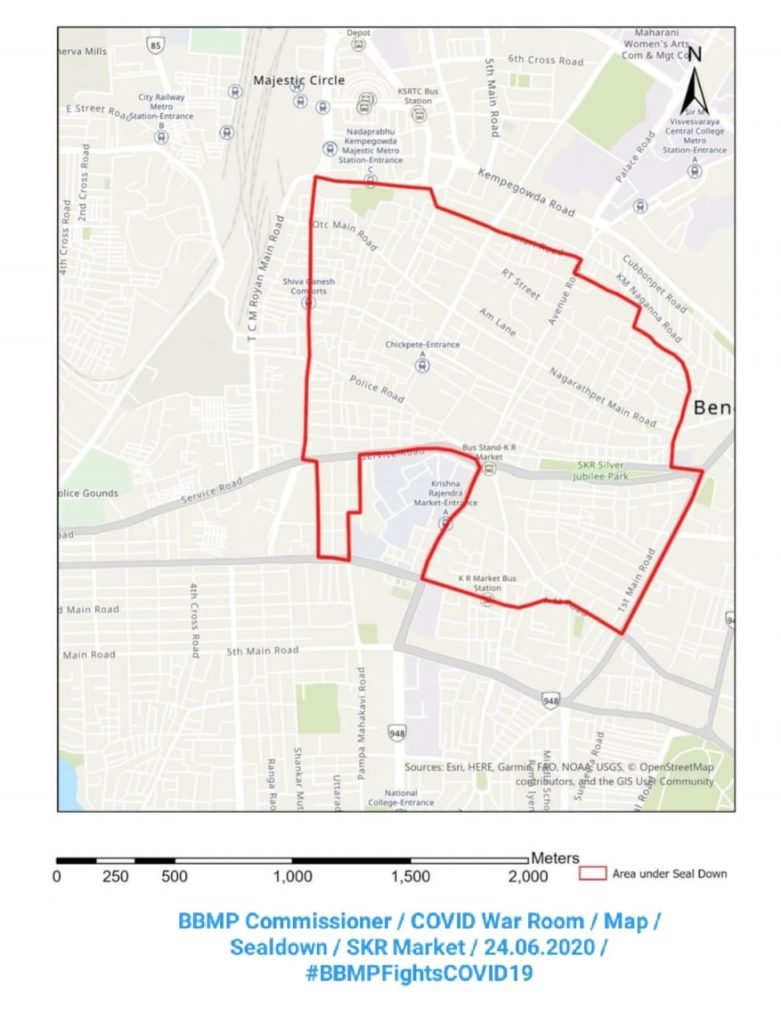 Public movement is completely banned in the areas enclosed by the following perimeter: Town Hall Circle-JC Road-AM Road-Kalasipalyam Main Road-KR Market Junction-Service Road-Thagarupet Road (2nd Main Road)-Tipu Sultan Palace Road-Thagarupet Road (4th Main Road)-Bhashyam Road-Srinivas Mandiram Road-Kilari Road-Anjaneya Temple Street- Sankalpet Road-SIP Road.