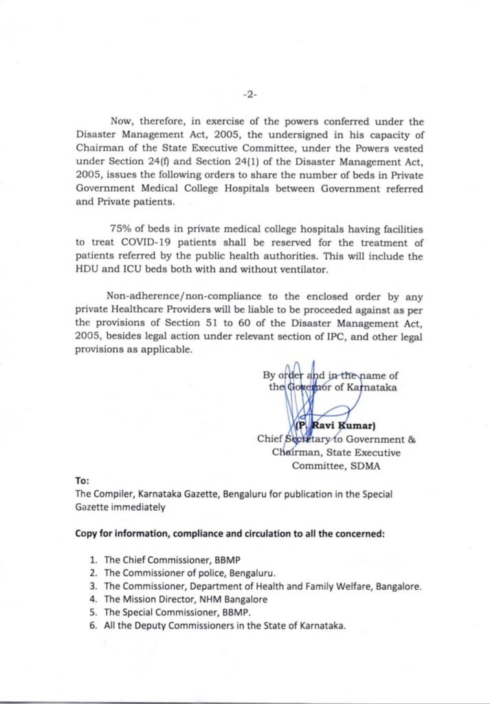 The order further states: “Non-adherence/non-compliance to the enclosed order by any private healthcare providers will be liable to be proceeded against as per the provisions of Section 51 to 60 of the Disaster Management Act, 2005, besides legal action under relevant sections of the IPC and other legal provisions as applicable.”
