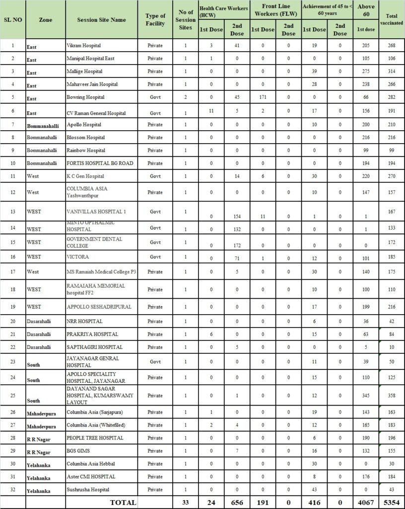 While Dayananda Hospital in Kumaraswamy Layout reported the highest number of vaccinations at 345, Columbia Asia Hospital at Hebbal, Sushrusha Hospital in Yelahanka and Government Dental College in Bengaluru West did not report a single vaccination.