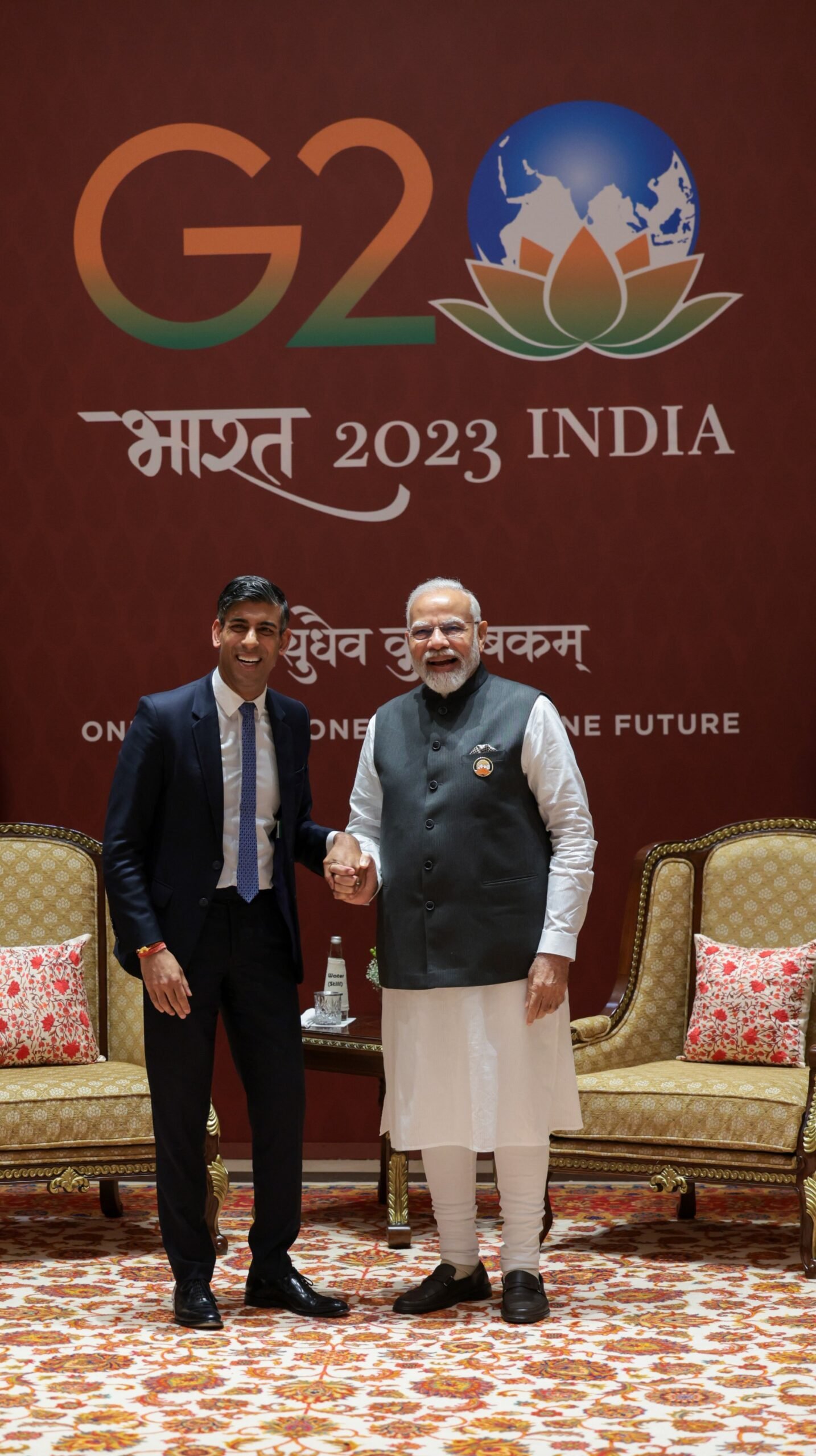 On the sidelines of the G20 Summit, Prime Ministers @narendramodi and @RishiSunak held a bilateral meeting. They discussed advancing the India-UK ties in sectors trade, commerce and more. pic.twitter.com/TlgqG779xd
