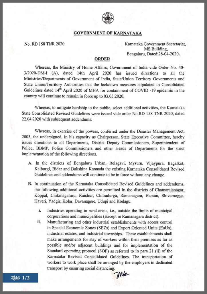Green zones in Karnataka will see a further relaxation of lockdown-related guidelines, following an order issued by Chief Secretary TM Vijay Bhaskar on Tuesday.