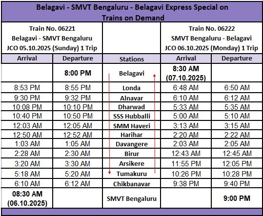 According to an official press release from Dr. Manjunath Kanamadi, Chief Public Relations Officer, SWR Hubballi, the Train No. 06221 Belagavi – SMVT Bengaluru Express Special will depart from Belagavi at 8:00 p.m. on October 5, 2025 (Sunday), and arrive at SMVT Bengaluru at 8:30 a.m. the following day.
