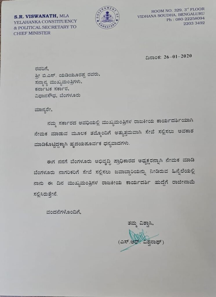 In his resignation letter to Chief Minister BS Yediyurappa, Vishwanath thanked the CM for allowing him to serve as a political aide.